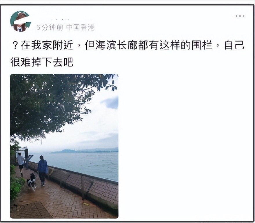 看到姜涛方回应称坠海是不小心发生的意外,有香港地区的网友晒出他坠海区域的现场图,表示海边有半身高的大围栏,自身没有额外动作很难不小心掉进海里,怀疑另有原因。从围栏图可以看出,这是一个倾斜的围栏,人要是靠着他站立或者趴下都会很不舒服,姜涛坠海前若没有靠着围栏很难发生意外,但具体的坠海原因恐怕还是只有当事人知道。