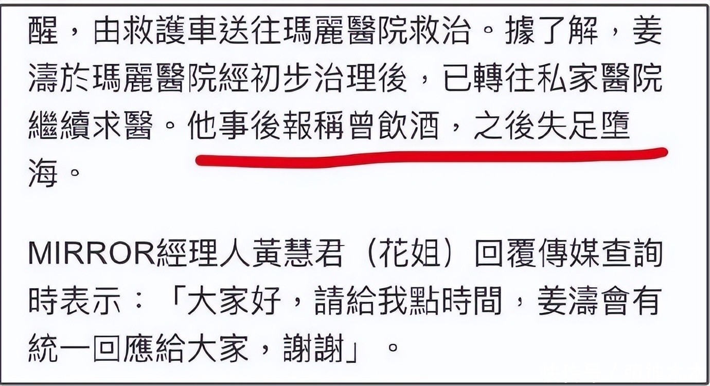 据港媒消息,姜涛下午在西区副食品批发市场附近坠海,途经的船只看到后救起把他送上岸,他全程保持清醒,在玛利亚医院治疗后又转入了私家医院。坠海消息曝光后,姜涛经纪人第一时间让大家稍安勿躁,会统一回复。同时,姜涛获救照片曝光,他身穿一身黑衣躺在地上,体型庞大,随后还上了呼吸器。